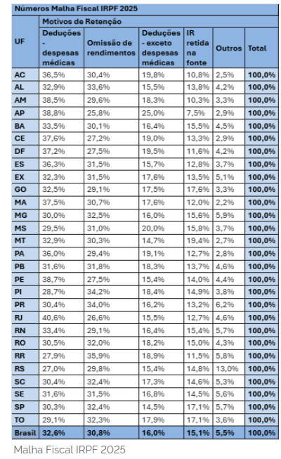 - 32,6% - Deduções – despesas médicas: as despesas médicas são o principal motivo de retenção, correspondendo a 32,6% do total de retenções;