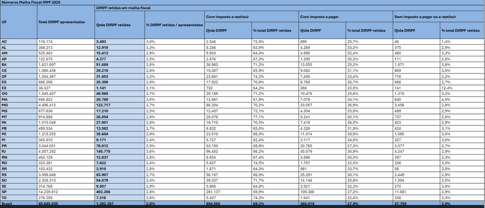 No processamento, 3.971.267 declarações (8,7%) ficaram retidas na malha fiscal, das quais mais de 66% já foram liberadas por terem sido regularizadas pelos próprios contribuintes sem a necessidade de fiscalização pela RFB.